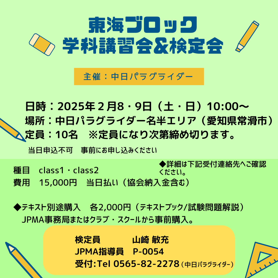 日頃は日本パラモーター協会の活動にご協力ありがとうございます。この度のJPMA学科講習・検定会は日本パラモーター協会の技量認定(クラスⅠ・クラスⅡ・クラスⅢ)を取得のために学科の講習と検定を行うものです。午前中に講習会を行いますが、受験を希望の方は事前に「テキストブック」、「学科試験問題解説」「クラスⅢテキストブック」をJPMA事務局またはクラブ・スクールから購入し、自習してから検定会にご参加ください。