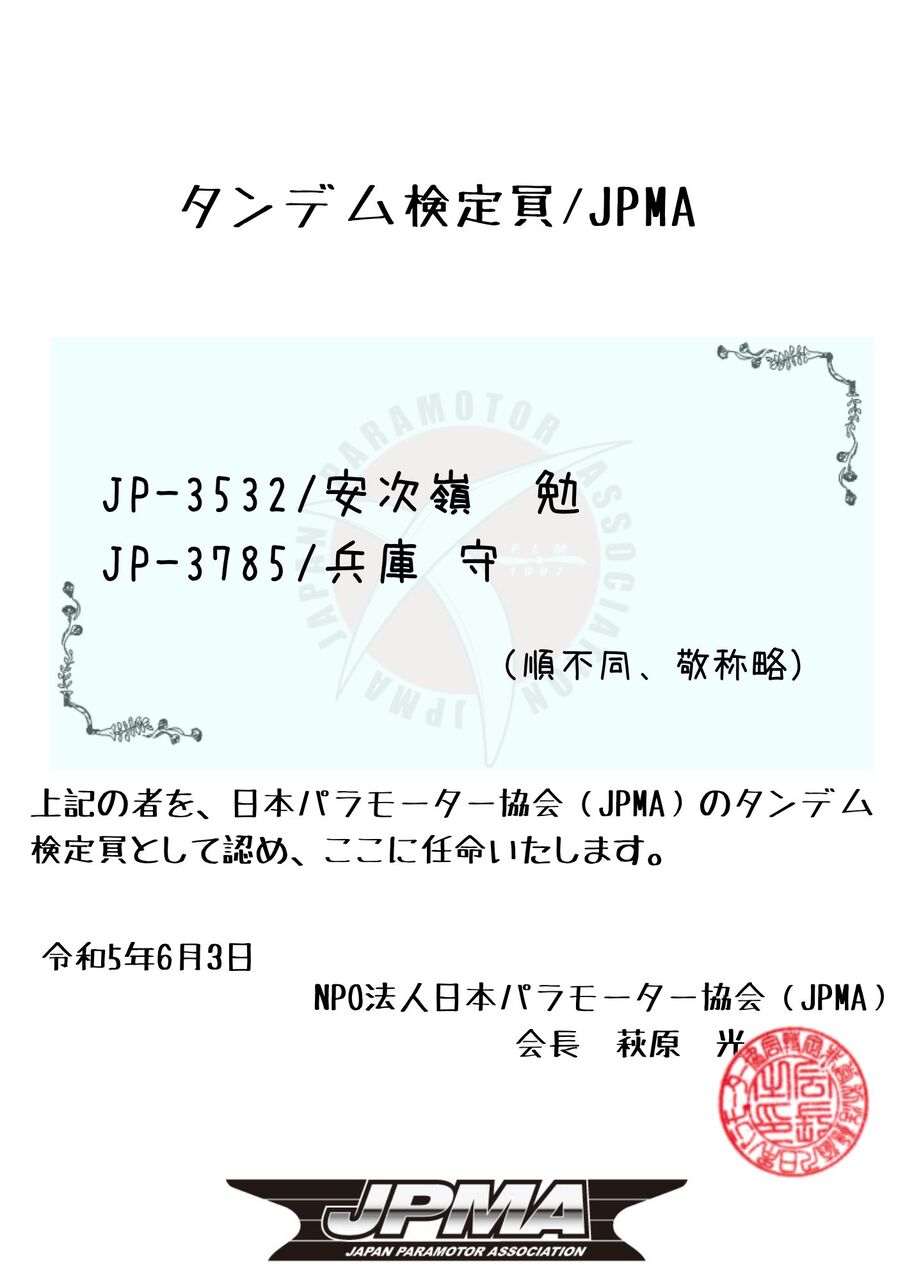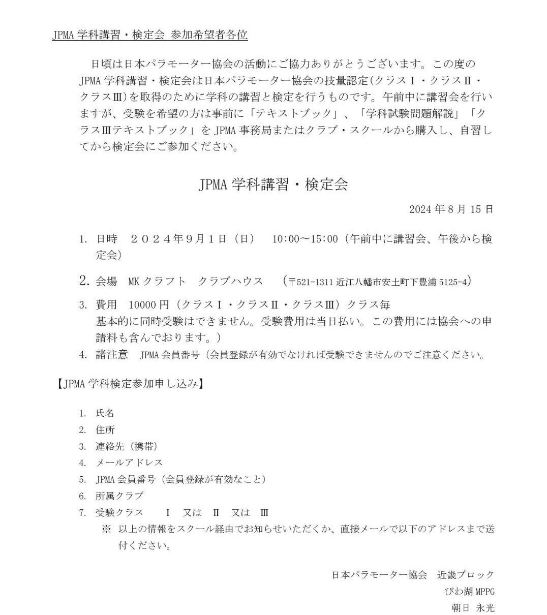この度はJPMA学科講習・検定会への参加ご希望、まことにありがとうございます。JPMA学科講習・検定会は日本パラモーター協会の技量認定(クラスⅠ・クラスⅡ・クラスⅢ)を取得のために学科の講習と検定を行うものです。午前中に講習会を行いますが、受験を希望の方は事前に「テキストブック」、「学科試験問題解説」をJPMA事務局またはクラブ・スクールから購入し、自習してから検定会にご参加ください。